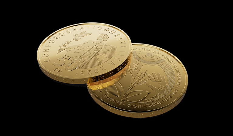 Die 11.29g schwere, mit Gold 0.900 legierte Sondermünze «175 Jahre Bundesverfassung» zeigt auf der Bildseite der Münze die Präambel der Bundesverfassung – symbolisch umgesetzt, greifen die inhaltlichen Begriffe ineinander und werden zu einem Sinnbild mit grosser Strahlkraft. Auf der Wertseite trägt ein Engel das Schweizer Wappen. In Anlehnung an die Diskussionen um den Gottesbezug in der Bundesverfassung, hat der Oltner Künstler, Peter Salzmann, bei dem Engel die Flügel weggelassen. «Wir sehen meist, was wir sehen wollen – und so bleibt eine uns vertraute Figur. Der Engel wird zur Helvetia, zur Friedensstifterin. Eine Tugend, die in der heutigen Zeit mehr denn je von Bedeutung ist», erklärt Salzmann.