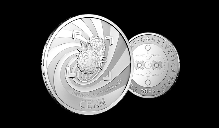 Die Silbermünze stellt eine Vorzeigemaschine des CERN in den Mittelpunkt, die als führendes Instrument für Forschung und Innovation in der Schweiz gilt. Das LHC (Large Hadron Collider oder Grosser Hadronen-Speicherring) des CERN ist der grösste Teilchenbeschleuniger der Welt. In diesem Ring mit einem Umfang von 27 km werden Protonen auf nahezu Lichtgeschwindigkeit beschleunigt und dann zur Kollision gebracht. Die Analyse dieser Kollisionen ermöglicht tiefere Einblicke in die grundlegende Struktur der Materie und die Funktionsweise des Universums. Die Bildseite der Münze zeigt eine dieser Kollisionen, die eine Vielzahl von Teilchen erzeugt, von denen einige gleich zu Beginn des Universums, kurz nach dem Urknall, vorhanden waren. Auf der Rückseite ist ein Magnet des Large Hadron Collider abgebildet. Diese supraleitenden Magnete sind technologische Meisterwerke. Sie erzeugen sehr starke Magnetfelder, um die Teilchenstrahlen im Ring zu führen und zu konzentrieren.
